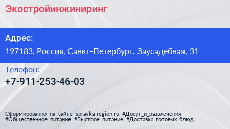 Экостройинжиниринг по адресу 197183, Россия, Санкт-Петербург, Заусадебная, 31 в дальнейшем Организация, размещена в следующих категориях: