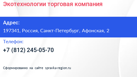 Экотехнологии, торговая компания по адресу 197341, Россия, Санкт-Петербург, Афонская, 2 в дальнейшем Организация, размещена в следующих категориях: