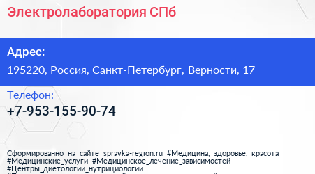 Электролаборатория СПб по адресу 195220, Россия, Санкт-Петербург, Верности, 17 в дальнейшем Организация, размещена в следующих категориях:
