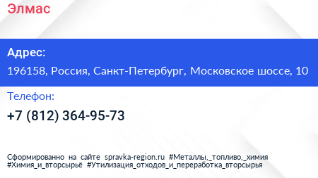 Элмас по адресу 196158, Россия, Санкт-Петербург, Московское шоссе, 10 в дальнейшем Организация, размещена в следующих категориях: