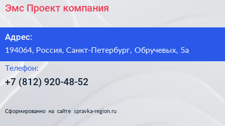 Эмс-Проект, компания по адресу 194064, Россия, Санкт-Петербург, Обручевых, 5а в дальнейшем Организация, размещена в следующих категориях: