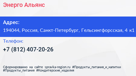 Энерго Альянс по адресу 194044, Россия, Санкт-Петербург, Гельсингфорсская, 4 к1 в дальнейшем Организация, размещена в следующих категориях:
