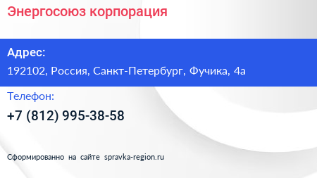 Энергосоюз, корпорация по адресу 192102, Россия, Санкт-Петербург, Фучика, 4а в дальнейшем Организация, размещена в следующих категориях: