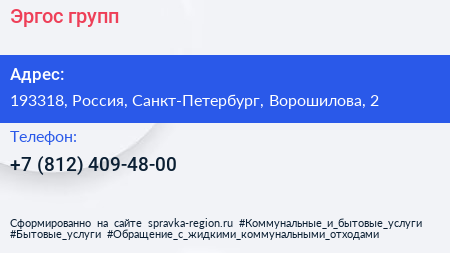 Эргос групп по адресу 193318, Россия, Санкт-Петербург, Ворошилова, 2 в дальнейшем Организация, размещена в следующих категориях: