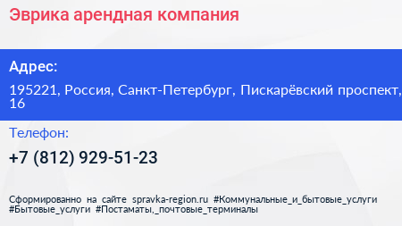 Эврика, арендная компания по адресу 195221, Россия, Санкт-Петербург, Пискарёвский проспект, 16 в дальнейшем Организация, размещена в следующих категориях: