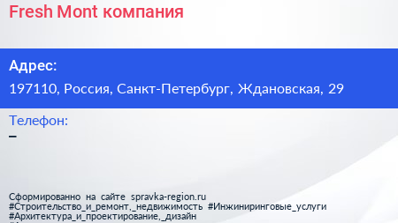 Fresh Mont, компания по адресу 197110, Россия, Санкт-Петербург, Ждановская, 29 в дальнейшем Организация, размещена в следующих категориях:
