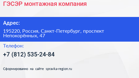 ГЭСЭР, монтажная компания по адресу 195220, Россия, Санкт-Петербург, проспект Непокорённых, 47 в дальнейшем Организация, размещена в следующих категориях: