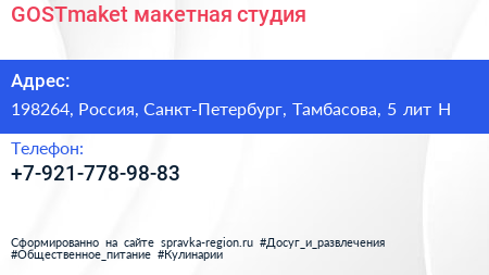 GOSTmaket, макетная студия по адресу 198264, Россия, Санкт-Петербург, Тамбасова, 5 лит Н в дальнейшем Организация, размещена в следующих категориях: