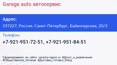 Garage auto, автосервис по адресу 197227, Россия, Санкт-Петербург, Байконурская, 20/3 в дальнейшем Организация, размещена в следующих категориях: