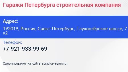 Гаражи Петербурга, строительная компания по адресу 192019, Россия, Санкт-Петербург, Глухоозёрское шоссе, 7 к2 в дальнейшем Организация, размещена в следующих категориях: