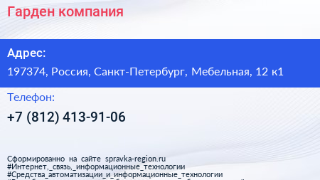 Гарден, компания по адресу 197374, Россия, Санкт-Петербург, Мебельная, 12 к1 в дальнейшем Организация, размещена в следующих категориях: