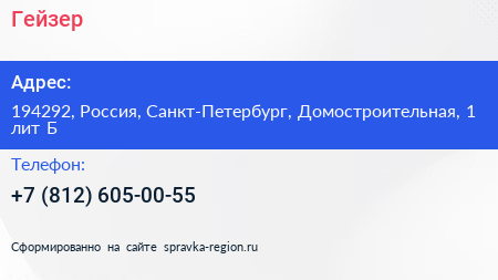 Гейзер по адресу 194292, Россия, Санкт-Петербург, Домостроительная, 1 лит Б в дальнейшем Организация, размещена в следующих категориях: