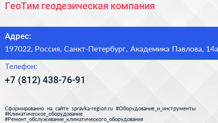 ГеоТим, геодезическая компания по адресу 197022, Россия, Санкт-Петербург, Академика Павлова, 14а в дальнейшем Организация, размещена в следующих категориях: