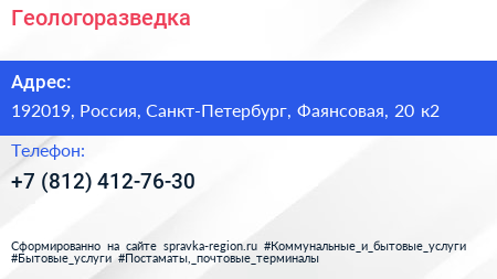 Геологоразведка по адресу 192019, Россия, Санкт-Петербург, Фаянсовая, 20 к2 в дальнейшем Организация, размещена в следующих категориях: