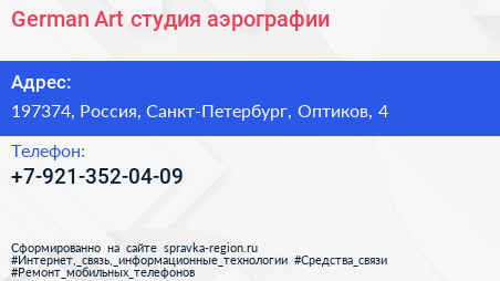 German-Art, студия аэрографии по адресу 197374, Россия, Санкт-Петербург, Оптиков, 4 в дальнейшем Организация, размещена в следующих категориях: