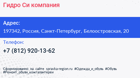Гидро-Си, компания по адресу 197342, Россия, Санкт-Петербург, Белоостровская, 20 в дальнейшем Организация, размещена в следующих категориях: