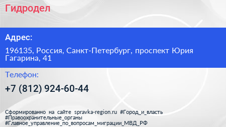 Гидродел по адресу 196135, Россия, Санкт-Петербург, проспект Юрия Гагарина, 41 в дальнейшем Организация, размещена в следующих категориях: