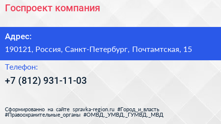Госпроект, компания по адресу 190121, Россия, Санкт-Петербург, Почтамтская, 15 в дальнейшем Организация, размещена в следующих категориях: