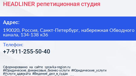 HEADLINER, репетиционная студия по адресу 190020, Россия, Санкт-Петербург, набережная Обводного канала, 134-138 к36 в дальнейшем Организация, размещена в следующих категориях: