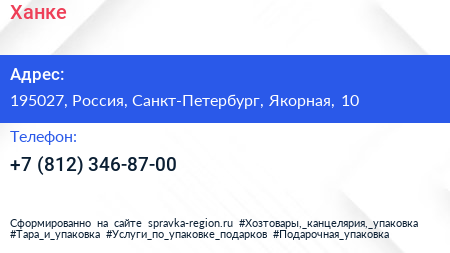 Ханке по адресу 195027, Россия, Санкт-Петербург, Якорная, 10 в дальнейшем Организация, размещена в следующих категориях: