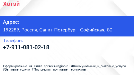 Хотэй по адресу 192289, Россия, Санкт-Петербург, Софийская, 80 в дальнейшем Организация, размещена в следующих категориях: