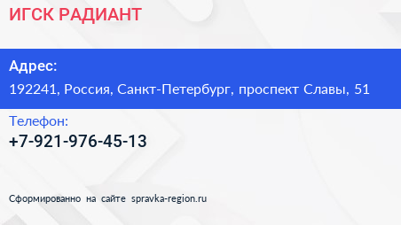 ИГСК РАДИАНТ по адресу 192241, Россия, Санкт-Петербург, проспект Славы, 51 в дальнейшем Организация, размещена в следующих категориях: