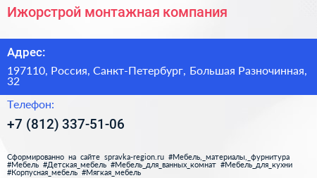Ижорстрой, монтажная компания по адресу 197110, Россия, Санкт-Петербург, Большая Разночинная, 32 в дальнейшем Организация, размещена в следующих категориях: