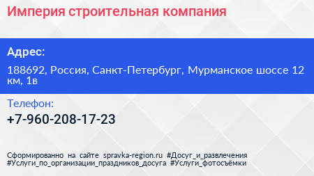 Империя, строительная компания по адресу 188692, Россия, Санкт-Петербург, Мурманское шоссе 12 км, 1в в дальнейшем Организация, размещена в следующих категориях:
