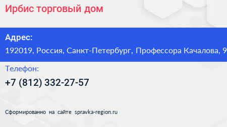Ирбис, торговый дом по адресу 192019, Россия, Санкт-Петербург, Профессора Качалова, 9 в дальнейшем Организация, размещена в следующих категориях: