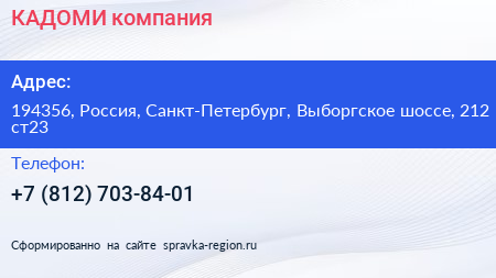 КАДОМИ, компания по адресу 194356, Россия, Санкт-Петербург, Выборгское шоссе, 212 ст23 в дальнейшем Организация, размещена в следующих категориях: