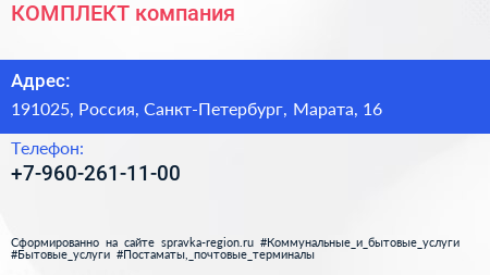 КОМПЛЕКТ, компания по адресу 191025, Россия, Санкт-Петербург, Марата, 16 в дальнейшем Организация, размещена в следующих категориях: