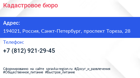 Кадастровое бюро по адресу 194021, Россия, Санкт-Петербург, проспект Тореза, 28 в дальнейшем Организация, размещена в следующих категориях: