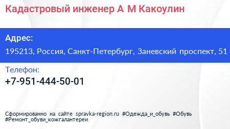 Кадастровый инженер А.М. Какоулин по адресу 195213, Россия, Санкт-Петербург, Заневский проспект, 51 в дальнейшем Организация, размещена в следующих категориях: