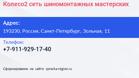 Колесо2, сеть шиномонтажных мастерских по адресу 193230, Россия, Санкт-Петербург, Зольная, 11 в дальнейшем Организация, размещена в следующих категориях: