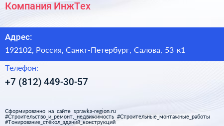 Компания ИнжТех по адресу 192102, Россия, Санкт-Петербург, Салова, 53 к1 в дальнейшем Организация, размещена в следующих категориях: