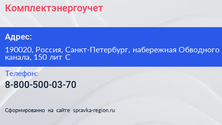 Комплектэнергоучет по адресу 190020, Россия, Санкт-Петербург, набережная Обводного канала, 150 лит С в дальнейшем Организация, размещена в следующих категориях: