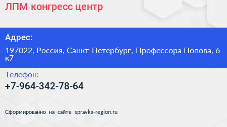 ЛПМ, конгресс-центр по адресу 197022, Россия, Санкт-Петербург, Профессора Попова, 6 к7 в дальнейшем Организация, размещена в следующих категориях: