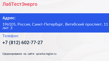 ЛабТестЭнерго по адресу 196105, Россия, Санкт-Петербург, Витебский проспект, 11 лит З в дальнейшем Организация, размещена в следующих категориях: