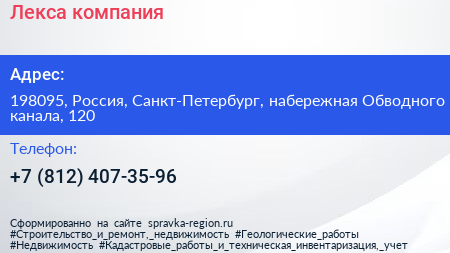 Лекса, компания по адресу 198095, Россия, Санкт-Петербург, набережная Обводного канала, 120 в дальнейшем Организация, размещена в следующих категориях:
