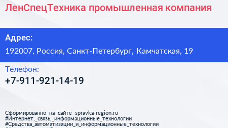 ЛенСпецТехника, промышленная компания по адресу 192007, Россия, Санкт-Петербург, Камчатская, 19 в дальнейшем Организация, размещена в следующих категориях: