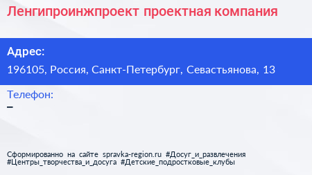 Ленгипроинжпроект, проектная компания по адресу 196105, Россия, Санкт-Петербург, Севастьянова, 13 в дальнейшем Организация, размещена в следующих категориях: