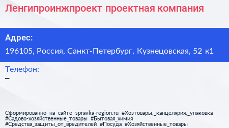 Ленгипроинжпроект, проектная компания по адресу 196105, Россия, Санкт-Петербург, Кузнецовская, 52 к1 в дальнейшем Организация, размещена в следующих категориях: