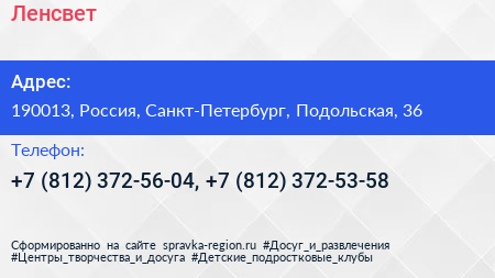 Ленсвет по адресу 190013, Россия, Санкт-Петербург, Подольская, 36 в дальнейшем Организация, размещена в следующих категориях: