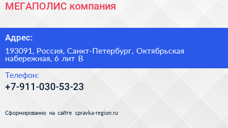 МЕГАПОЛИС, компания по адресу 193091, Россия, Санкт-Петербург, Октябрьская набережная, 6 лит В в дальнейшем Организация, размещена в следующих категориях: