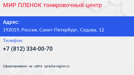 МИР ПЛЕНОК, тонировочный центр по адресу 192019, Россия, Санкт-Петербург, Седова, 12 в дальнейшем Организация, размещена в следующих категориях: