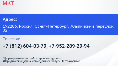 МКТ по адресу 192286, Россия, Санкт-Петербург, Альпийский переулок, 32 в дальнейшем Организация, размещена в следующих категориях:
