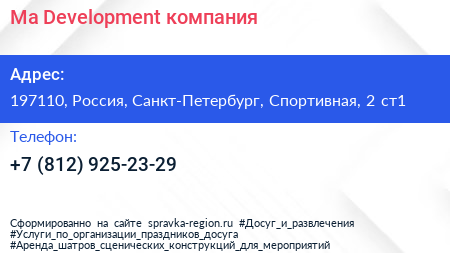 Ma Development, компания по адресу 197110, Россия, Санкт-Петербург, Спортивная, 2 ст1 в дальнейшем Организация, размещена в следующих категориях: