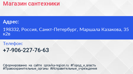 Магазин сантехники по адресу 198332, Россия, Санкт-Петербург, Маршала Казакова, 35 к2в в дальнейшем Организация, размещена в следующих категориях: