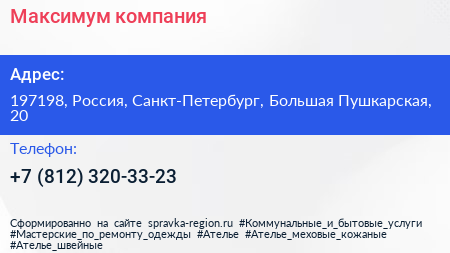 Максимум, компания по адресу 197198, Россия, Санкт-Петербург, Большая Пушкарская, 20 в дальнейшем Организация, размещена в следующих категориях:
