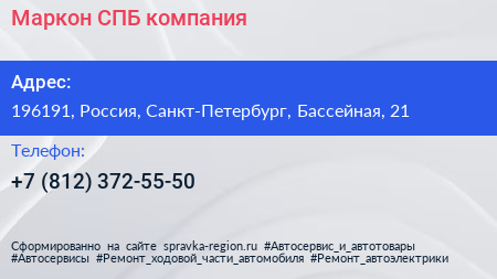 Маркон-СПБ, компания по адресу 196191, Россия, Санкт-Петербург, Бассейная, 21 в дальнейшем Организация, размещена в следующих категориях: